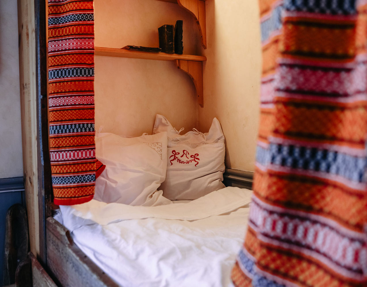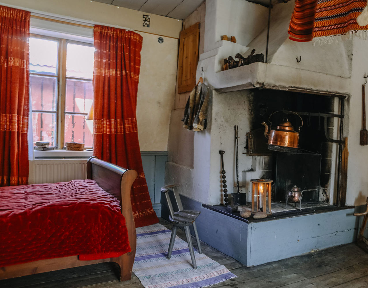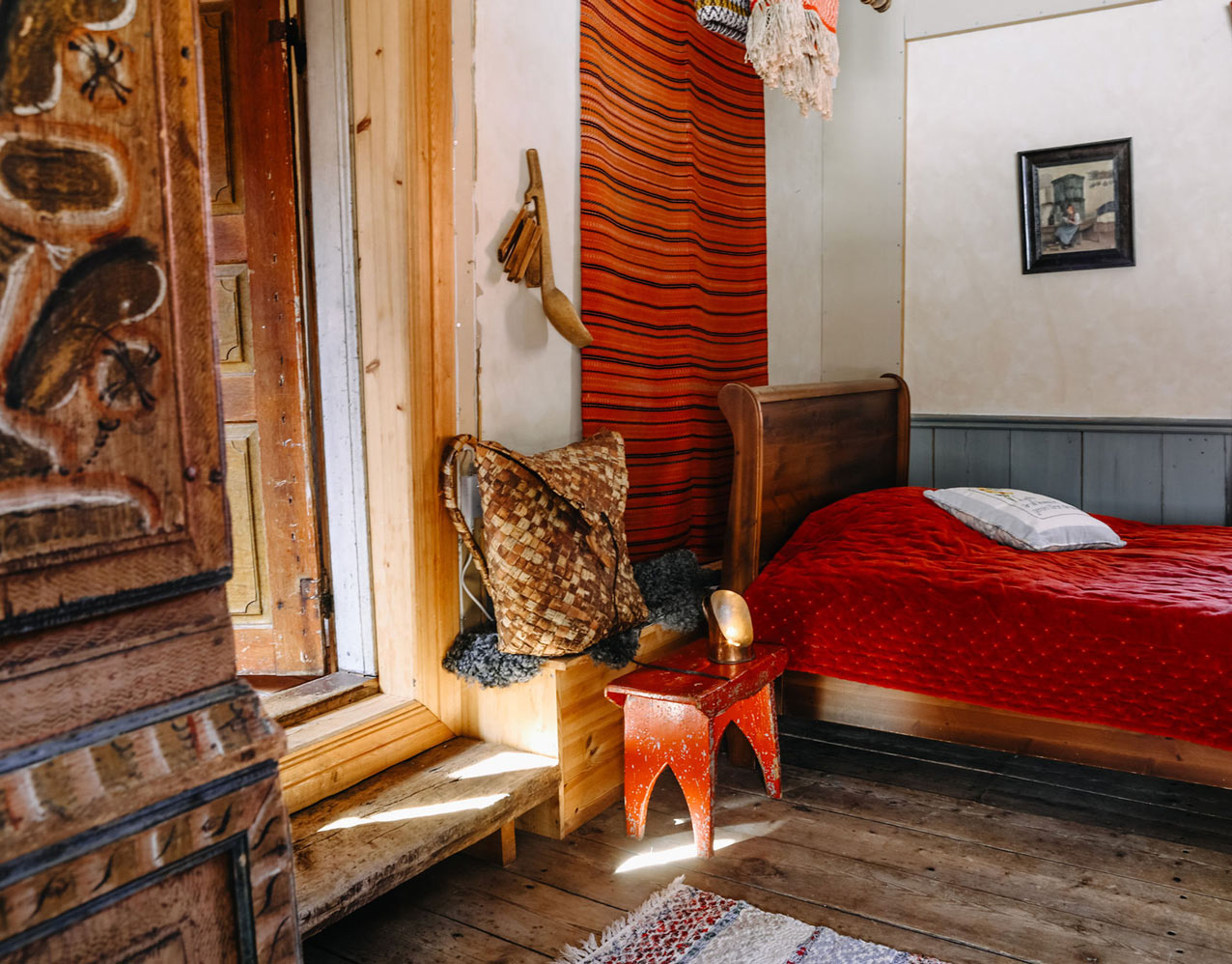 Stugan är en klassisk 1800-talsbyggnad i Mora, så här såg husen ut. I en sådanhär byggnad var det vanligt att runt 20 personer bodde i slutet av 1800-talet. Nu förtiden har vi en 120 cm bred säng samt en 80 cm bred skåpsäng. Det finns också en bäddsoffa som går att bädda upp vid förfrågan.